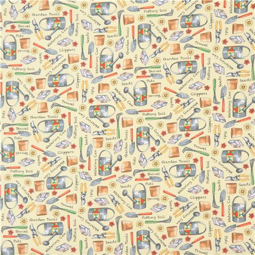 light yellow fabric with gardening tool watering can clipper Quilting