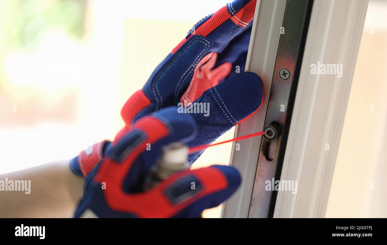 Repairman using lubricate for fix up problem with lock of plastic