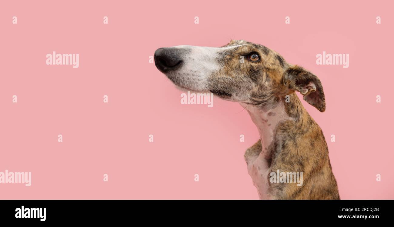 Profile brindle greyhound dog looking away with atentive and sad