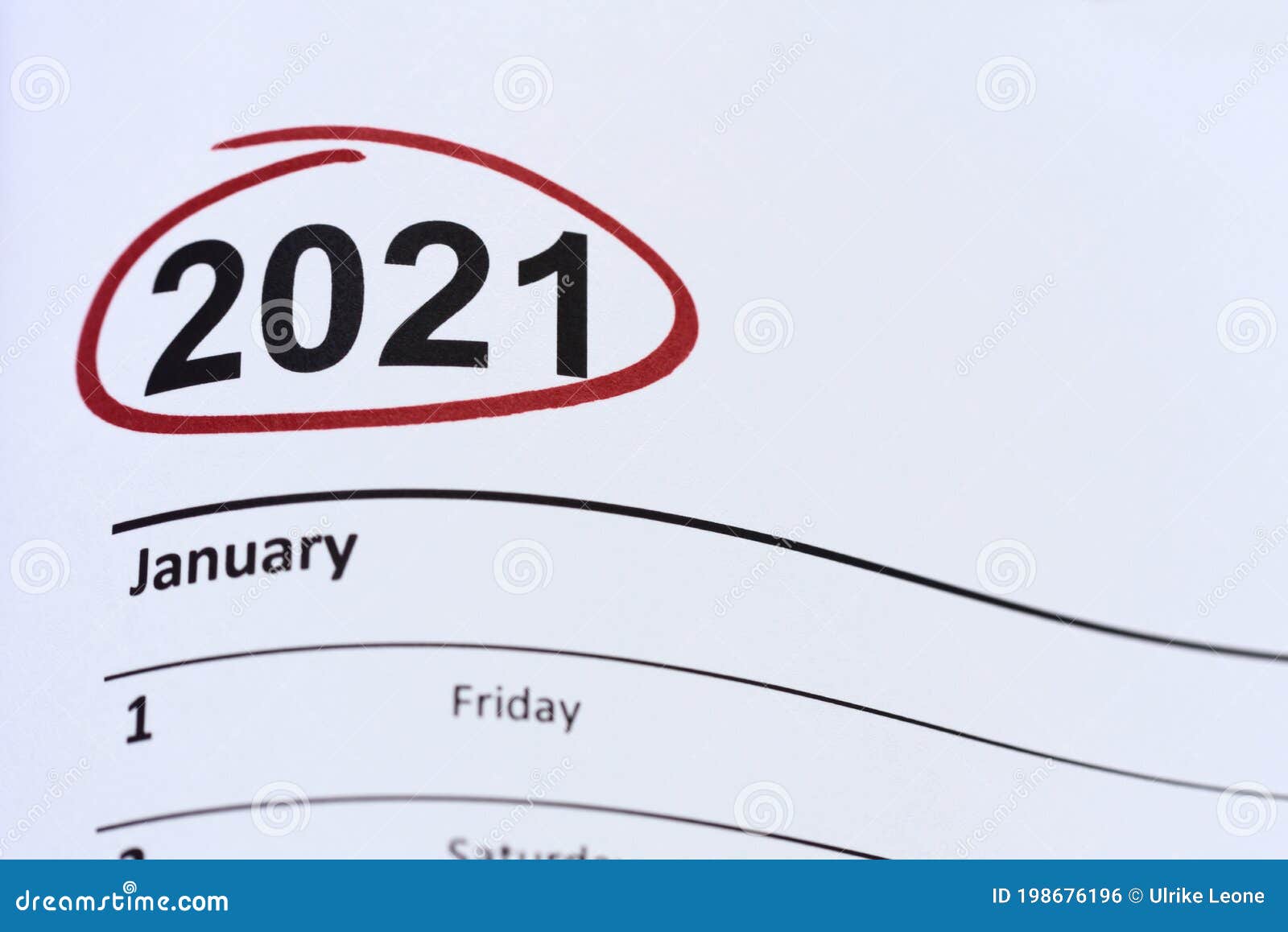 The First Page of a Calendar in English with the Year 2021 Circled in Red Stock Photo Image of