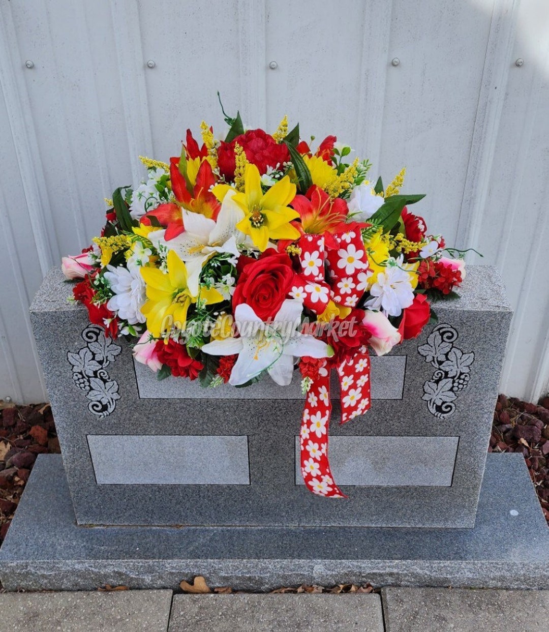 Yellow & Orange Large Spring Cemetery Headstone Saddlegrave Etsy Cemetery flowers, Memorial Flowers For Headstones Their early blooms and serene beauty make hellebores a thoughtful choice for planting near graves. Choose from sprays, vases, bushes, crosses, pillows,. Check out our headstone flowers selection for the very best in unique or custom, handmade pieces from our grave markers & decoration shops. Graveside flowers creates its own headstone. For instance, roses symbolize love and grief—red roses for. Flowers For Headstones.