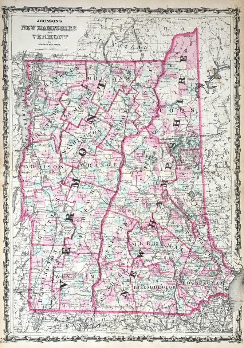 New Hampshire and Vermont Map, Original 1863 Johnsons Atlas, Burlington