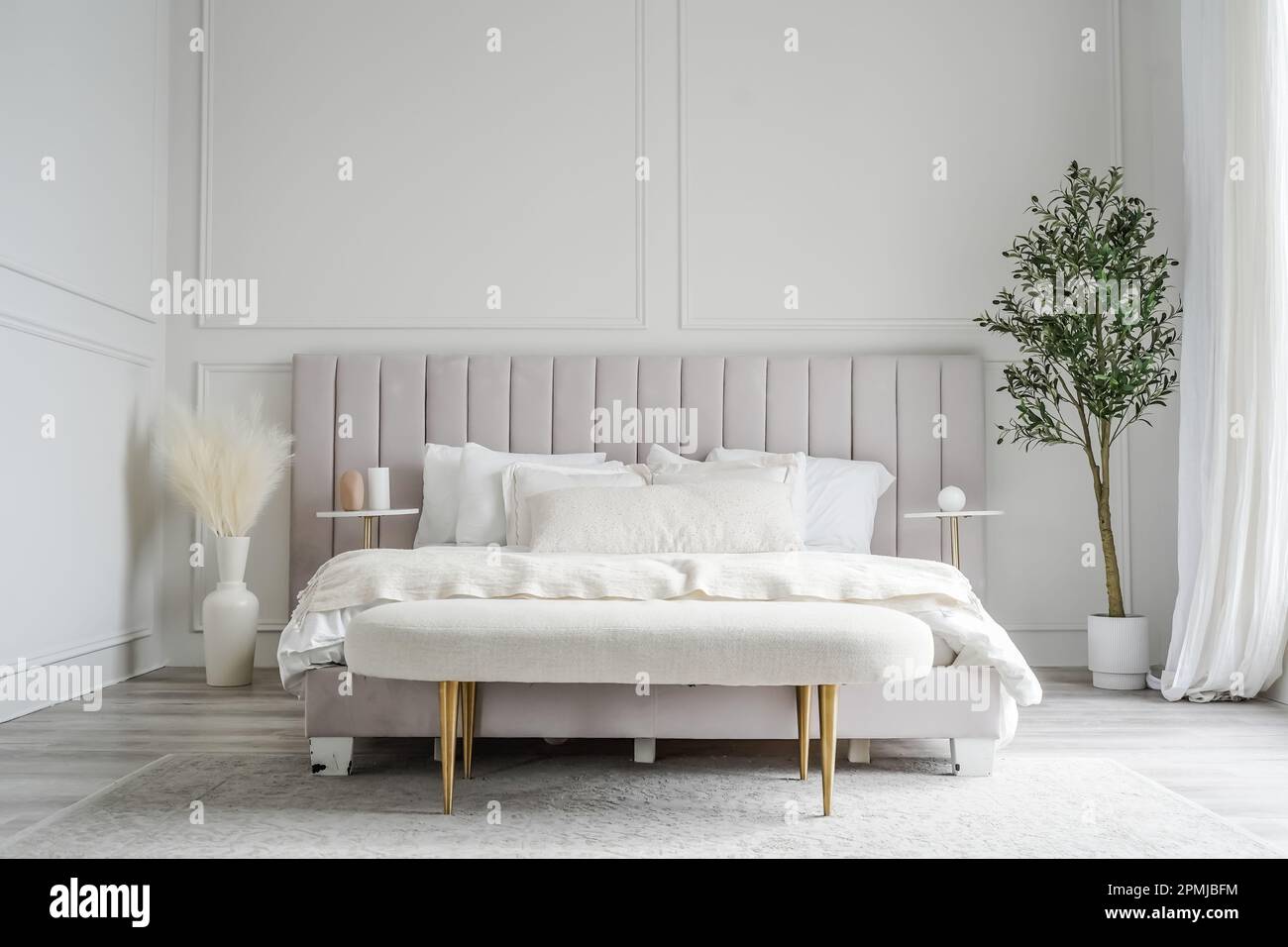 A modern looking bedroom with high ceiling and large window Stock Photo