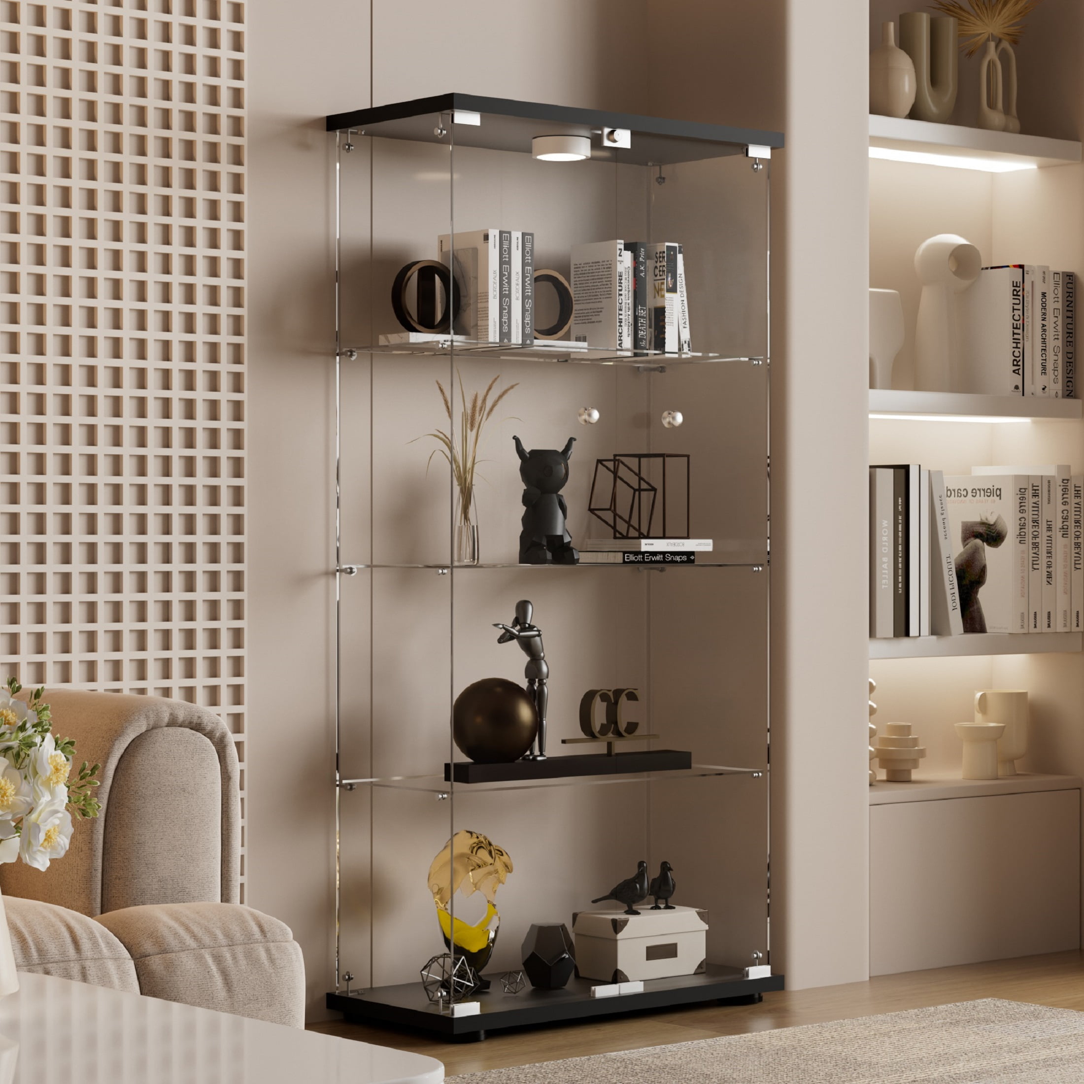 Glass Display Cabinet Black Tempered glass doors and windows create a sophisticated display for collectibles or mementos, while the tall corner design fits neatly into small spaces. Tempered glass doors and windows create a sophisticated display for collectibles or mementos, while the tall corner design fits neatly into small spaces. 50+ bought in past month.