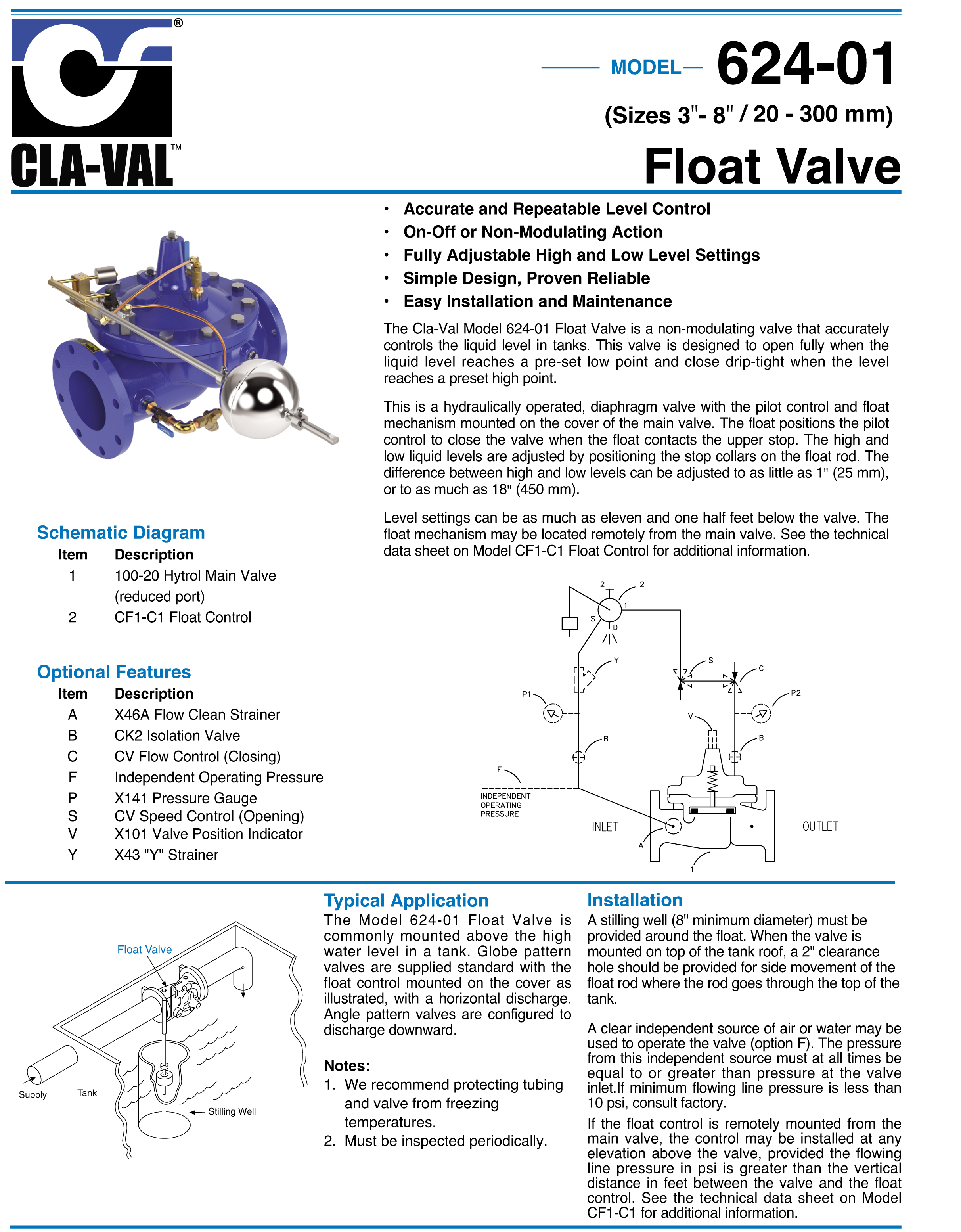 CLAVAL 100CF1 ON/OFF Float Valve Float Valve Cla-Val These valves are designed to open fully when the liquid level reaches a. They can be installed to control the flow into or out of the tank by either closing on a rising level or opening on a rising level. Level and closes drip tight when the filing of the tank reaches the. Float Valve Cla-Val.