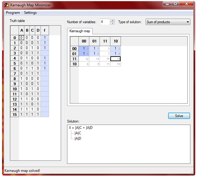 Tips· to solve the expression manually, select the number of variables above, and leave the expression input. Karnaugh map builder and solver. Online karnaugh map solver that makes a kmap, shows you how to group the terms, shows the simplified boolean equation, and draws the. Boolean algebra expression simplifier & solver. Switch the values between 0, 1 and x (don't care) and see the result simultaneously. All in one boolean expression. Allows the user to input values for a karnaugh map and recieve boolean expressions for the output. Detailed steps, logic circuits, kmap, truth table, & quizes.