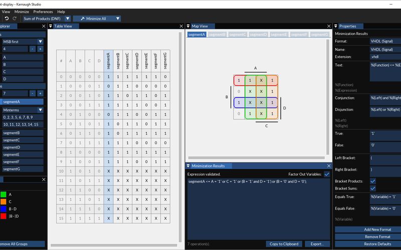 K Maps Generator . Karnaugh map builder and solver. Detailed steps, logic circuits, kmap, truth table, & quizes. Allows the user to input values for a karnaugh map and recieve boolean expressions for the output. All in one boolean expression. Boolean algebra expression simplifier & solver. Switch the values between 0, 1 and x (don't care) and see the result simultaneously. Online karnaugh map solver that makes a kmap, shows you how to group the terms, shows the simplified boolean equation, and draws the. Tips· to solve the expression manually, select the number of variables above, and leave the expression input.