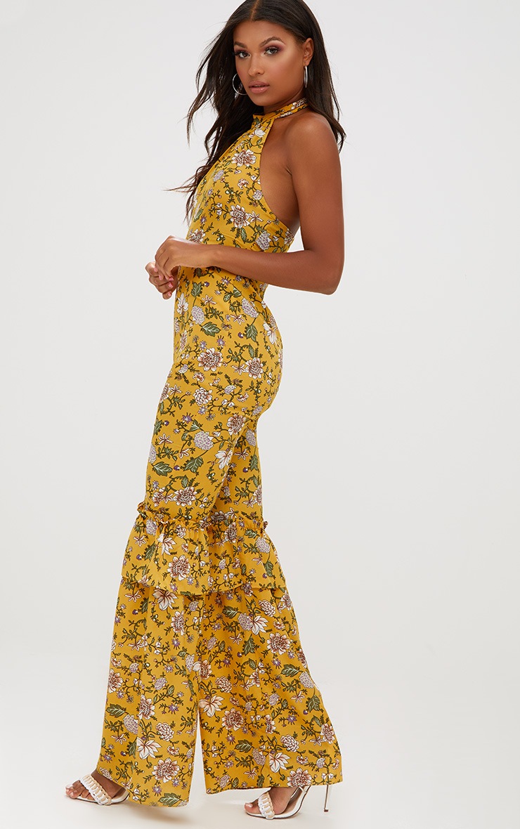 Mustard Floral High Neck Frill Leg Jumpsuit PrettyLittleThing
