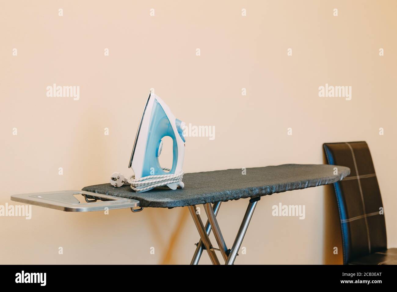 A blue iron on an ironing board with a cover near the chair in the room