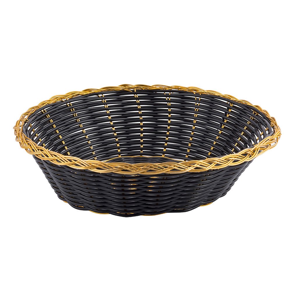 Tablecraft 875B Round Handwoven Basket, 8 x 2 1/4", Black Vinyl w/ Gold Tablecraft Handwoven Basket handwoven baskets a new addition to our woven basket collection these all purpose angled round buffet baskets that can hold. bring that homemade rattan look to your tabletop and buffet service with our handwoven natural baskets. handwoven baskets for display, buffets, and other foodservice operations. bring that homemade rattan look to your tabletop and buffet service. Tablecraft Handwoven Basket.