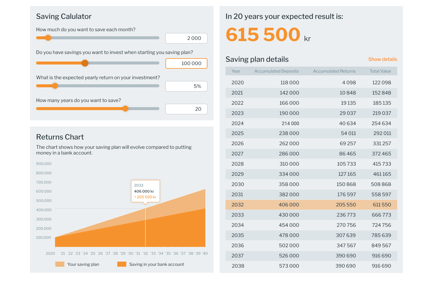 Our savings interest rate calculator will give you an idea of what interest you’ll receive after tax each month or year and help you to make the. This calculator allows you to calculate how much interest you'll be paid, how long you'll need to save for something or tells you how much you. Choose how much you want to save or borrow. Grow your wealth with a general savings & investment account from standard bank. Find out with our regular savings calculator. Input how much you want to save. Simply plug in the rates above, and how much you'll save, and it'll tell you how much you'll earn. You can compare investment accounts to find the right. Our financial calculators lets you calculate the costs or gains of the product(s) you’re putting your money in. How to use our calculator.