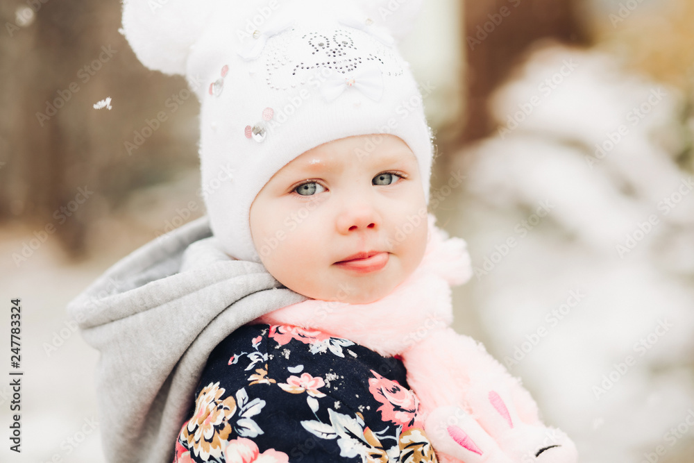 Portrait of baby girl with blue eyes turned at camera. Kid playing and