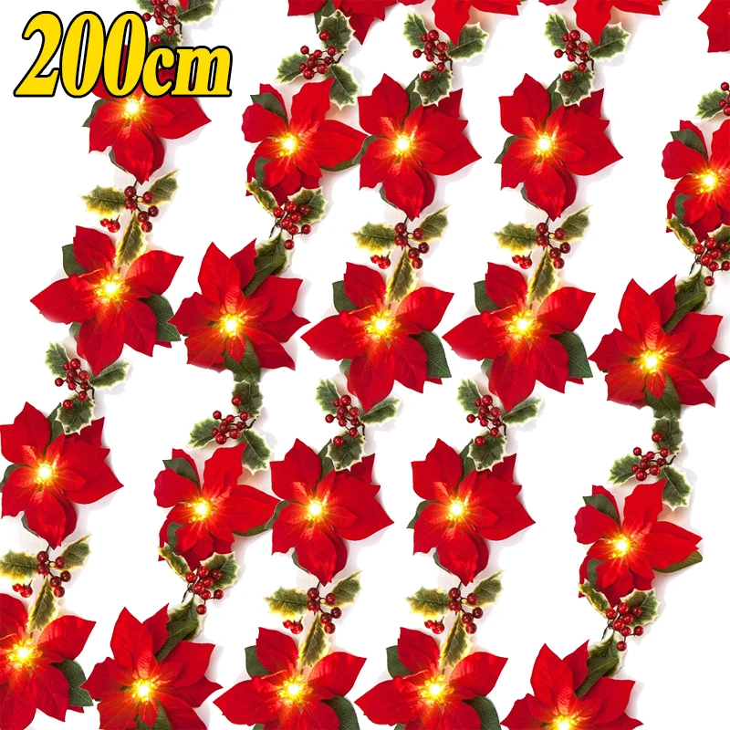 200cmPoinsettiaChristmasFlowersOrnamentsArtificialRedBerryHollyLeavesStringLights