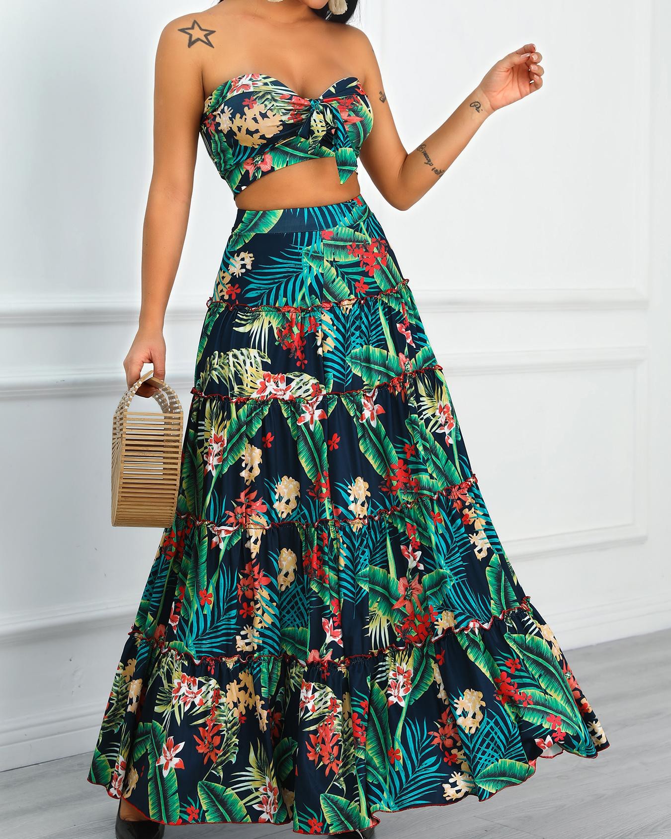 Tropical Print Crop Top & Maxi Skirt Set