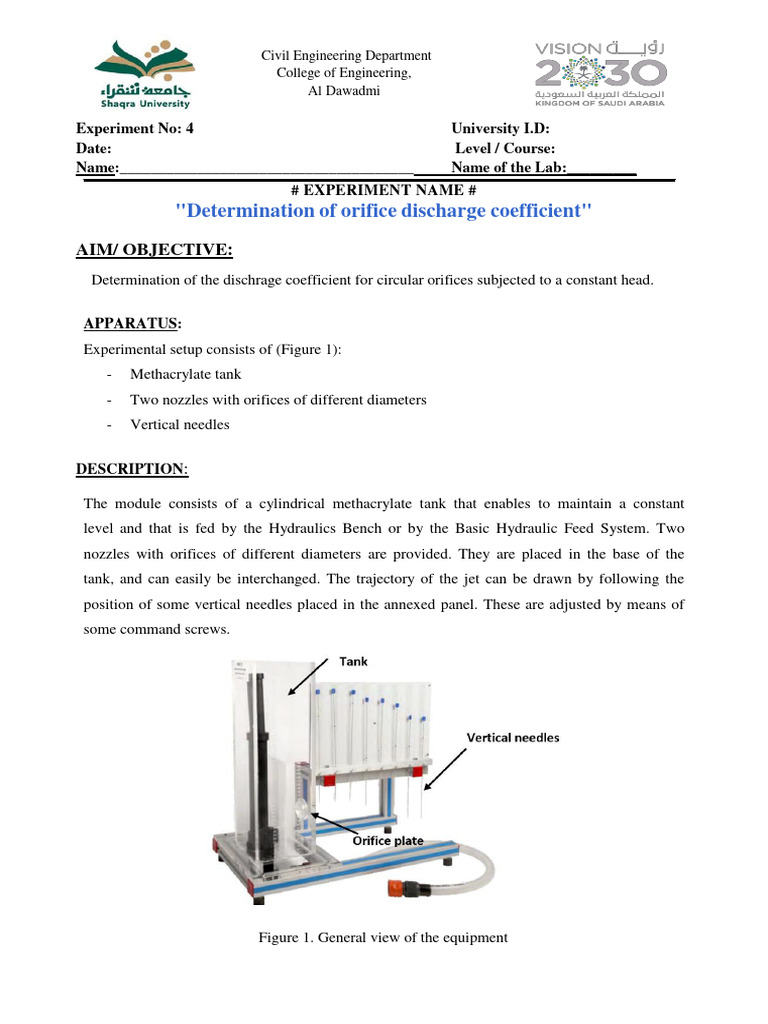 "Determination of Orifice Discharge Coefficient" Aim/ Objective PDF