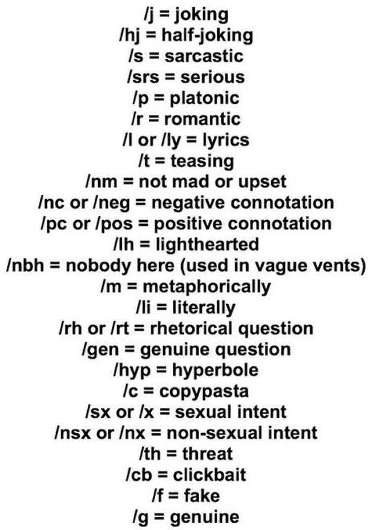 This carrd was made after i had a discussion in a discord server about tone tags, and we discovered that the original carrd is no longer being updated. Tone tags/indicators are short text at the end of a message to let the reader know how the message is meant to be read, clear up any. You can see tone tags. Welcome to the tone indicator dictionary, an easy repository of tone indicators, their variations, and their meanings. Scroll to the bottom of the page to suggest an addition, and to see credits. Tone indicators are shorthand for words used to convey tone, which the cambridge dictionary defines as a quality in the voice that expresses the speaker's feelings or thoughts. A masterlist of tone indicators for those who need or want to use them. This list will be constantly updated so don't be afraid to contact the owner for updated or new indicators.