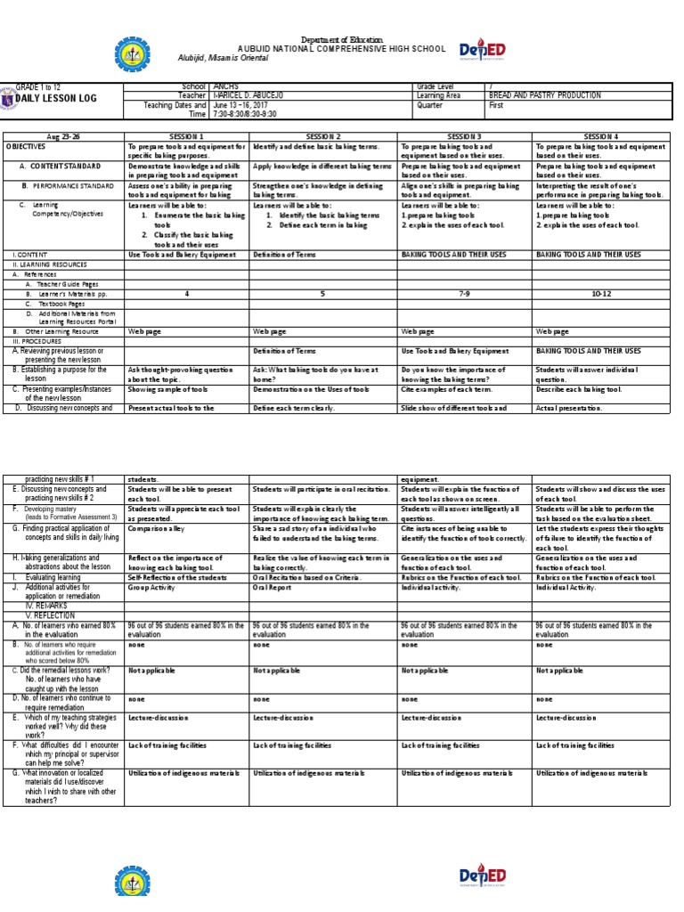 Dllbreadandpastryg78 GRADE 1 to 12 DAILY LESSON LOG School Bread And Pastry Exploratory Dll This learning module was developed for the exploratory courses in technology and livelihood education, grades 7. Reference k to 12 basic education curriculum technology and livelihood education. Bread And Pastry Exploratory Dll.