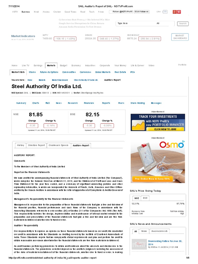 SAIL_ Auditor's Report of SAIL NDTVProfit Audit Financial Statement