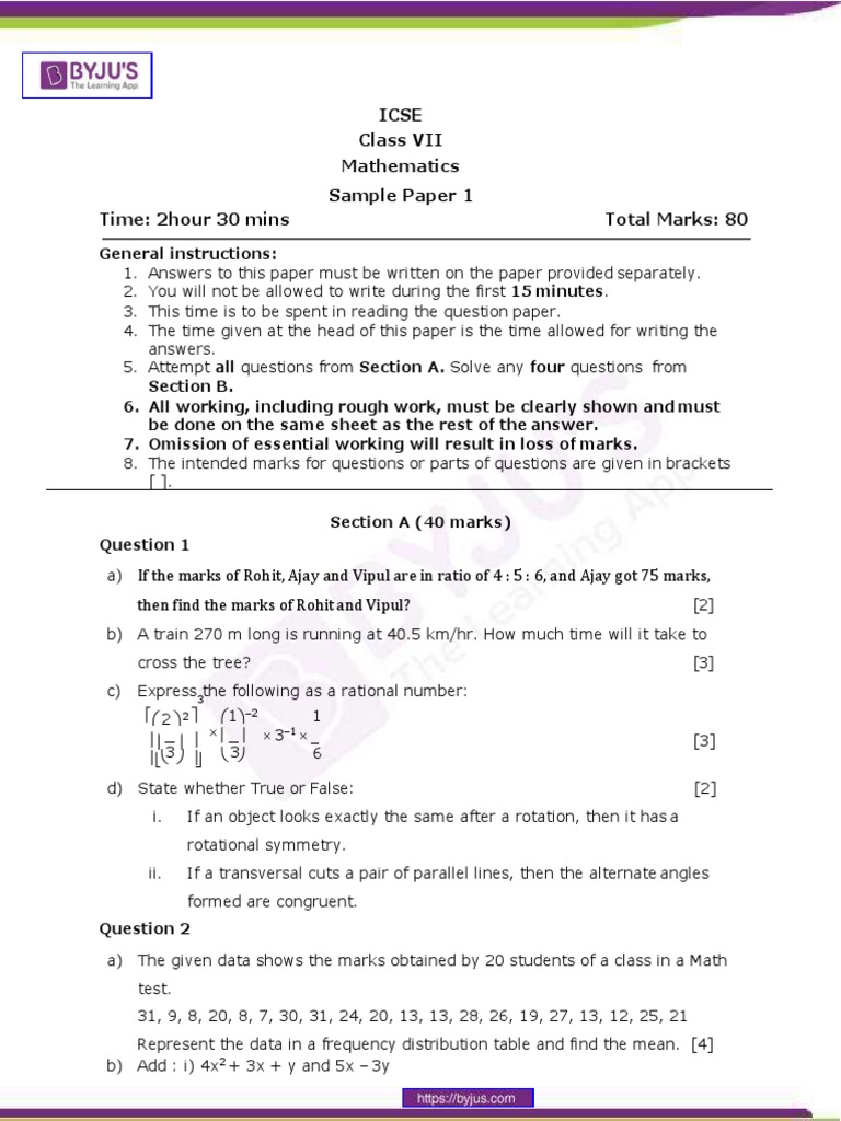 ICSE Class 7 Mathematics Sample Paper for 20202021 Class 10 Maths Paper Icse icse class 10 previous year question papers are provided in this article. Students can view or download the icse board 10th maths previous year question papers with solutions for their upcoming examination. students can access the icse question paper for class 10 major subjects such as maths, physics, chemistry, biology, geography,. here we have given icse class. Class 10 Maths Paper Icse.