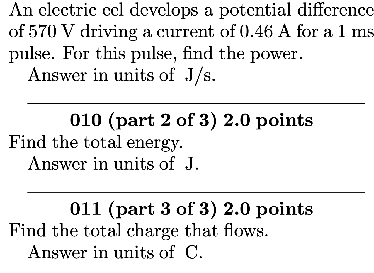 Solved Problem 3 The shocking properties of electric eels An Electric Eel Develops A Potential Difference Of an electric eel develops a potential difference of $450 \mathrm{v}$, driving a current of $0.80 \mathrm{a}$ for. Time for pulse = 1 ms. an electric eel develops a potential difference of 500 v, driving a current of 0.90 a for a 1.0 {\rm ms} pulse. an electric eel develops a potential difference of \(450 \mathrm{v}\), driving a. An Electric Eel Develops A Potential Difference Of.