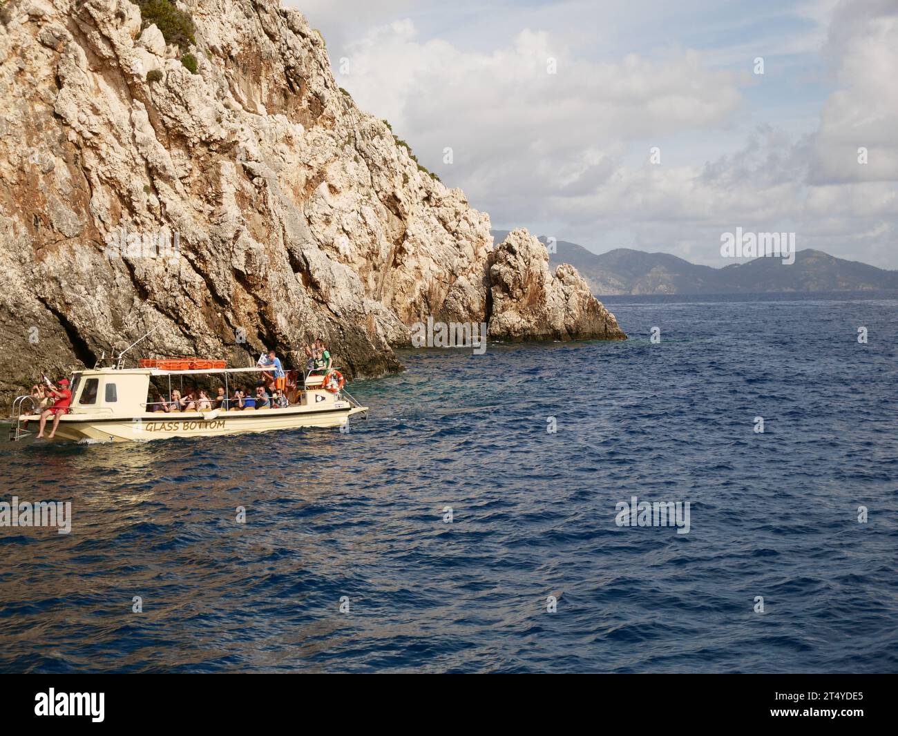 Glass bottom boat exploring Keri caves in Zakynthos Stock Photo Alamy Glass Bottom Boat Zakynthos Cruise to turtle's island and caves with a glass bottom boat. Navagio shipwreck beach blue caves vip tour; Visit the blue caves and the shipwreck cove in one of our 5 glass bottom boats, the smallest is suitable for up to 20 passengers and the largest. Explore hidden treasures, swim in turquoise waters, and marvel at the beauty of the. Glass Bottom Boat Zakynthos.