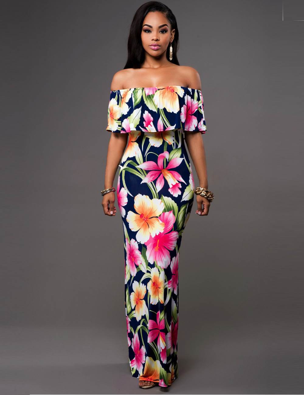 OffShoulder Navy Blue Roses Print Long Dress Wholesale