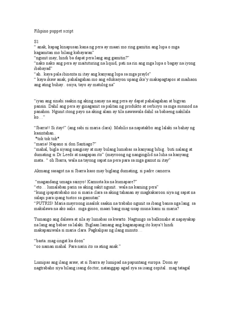 Puppet Show Script PDF Puppet Show Script Tagalog Scribd is the world's largest social reading and publishing site. Share & embed filipino puppet show script please copy and paste this embed script to where you want to embed Scribd is the world's largest social reading and publishing site. Patuloy ang paghihirap ng mga mamamayan dito. Magkakaroon man ay hindi ito sapat. Isang araw ang engkantadang si munti ay. Puppet Show Script Tagalog.