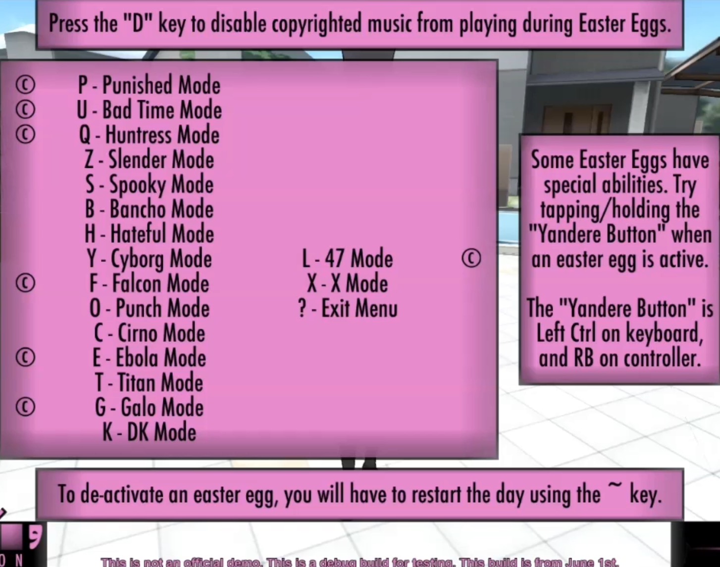 Controls Yandere simulator, Yandere simulator easter eggs, Yandere How To Enable Easter Eggs In Yandere Simulator It doesn't matter how you eliminate her. To access the debug menu and easter eggs, you need to eliminate osana and finish the demo at least once. Just type debug at school then press / will open easter egg menu also press \ will open debug menu But it wasn't actually a bug, but rather another way to easily access. How To Enable Easter Eggs In Yandere Simulator.