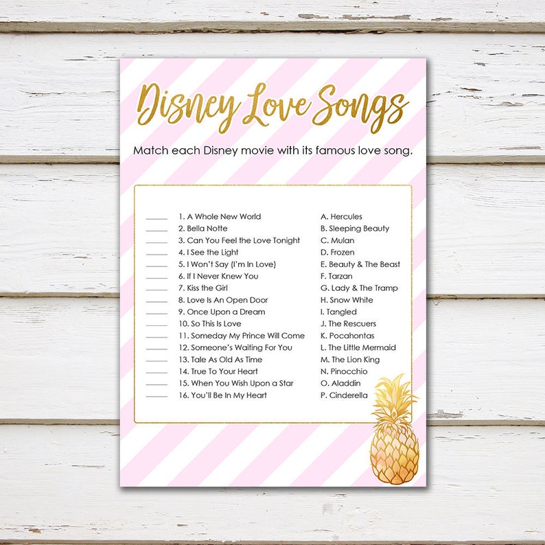 Match the Disney LOVE SONGS Bridal Shower game with gold and blush/pink Bridal Shower Disney Games Step it up with this game by creating a playlist featuring all of the songs included and play it during the shower! Download a free printable game card (2 versions) below. Congratulate the bride to be by hosting a magical world of. Players try and match popular disney love songs with the correct disney movie. Whether you love happily ever. Bridal Shower Disney Games.