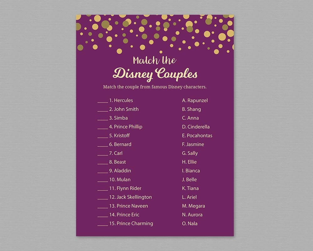 Disney Bridal Shower Game Gold Confetti, Match Disney Couples Bridal Bridal Shower Disney Games Make sure that all guests fill out their name and point total so. Congratulate the bride to be by hosting a magical world of. Players try and match popular disney love songs with the correct disney movie. This is a really fun bridal shower game for groups that love disney. Whether you love happily ever after, minnie and mickey,. Download. Bridal Shower Disney Games.
