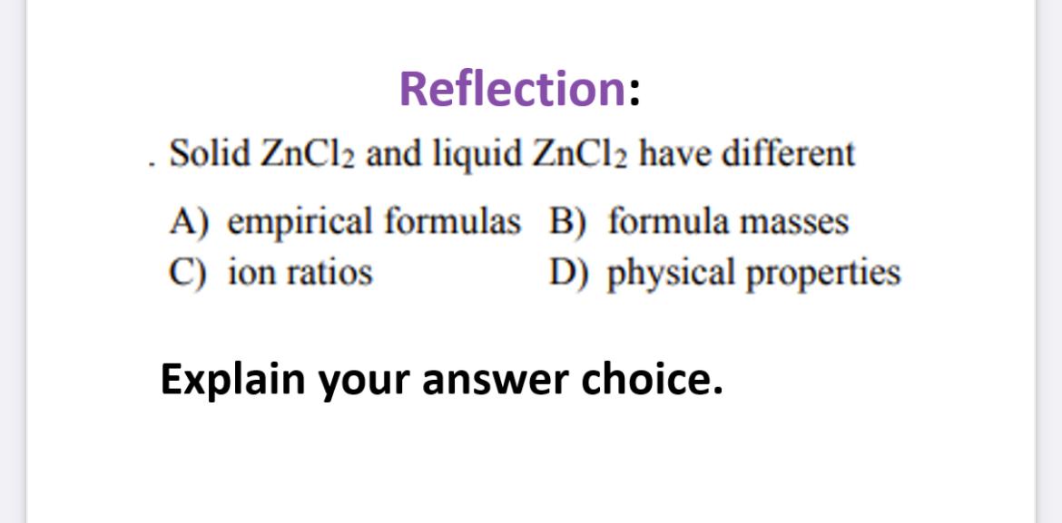 Solved Reflection Solid ZnCl2 and liquid ZnCl2 have
