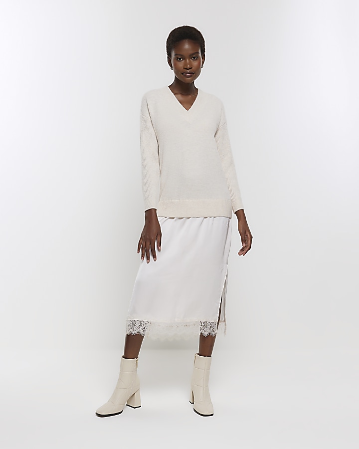 Cream satin jumper midi dress River Island