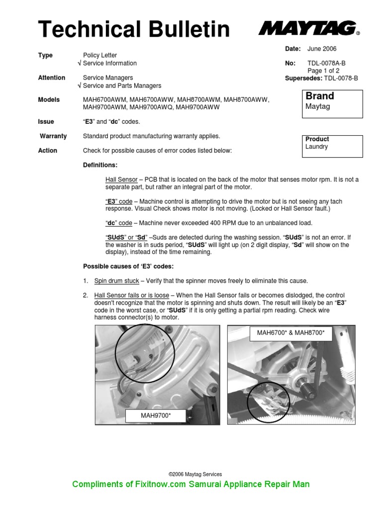 Troubleshooting the “E3” error code in Maytag MAH6700, MAH8700, and Maytag Front Load Washer E3 Error Code These codes mean the door is not unlocking. Learn how to check the drum, the motor harness, and the hall sensor connector, and when to replace the motor or the hall sensor. The e3 error means that the control board is detecting current going to the motor, but the motor won't turn properly. So here is how to read maytag. Maytag Front Load Washer E3 Error Code.
