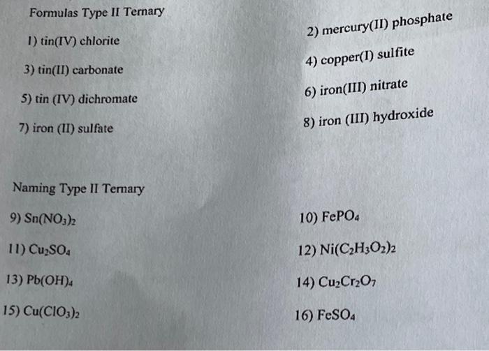 Solved Formulas Type II Ternary 1) tin(IV) chlorite 3)