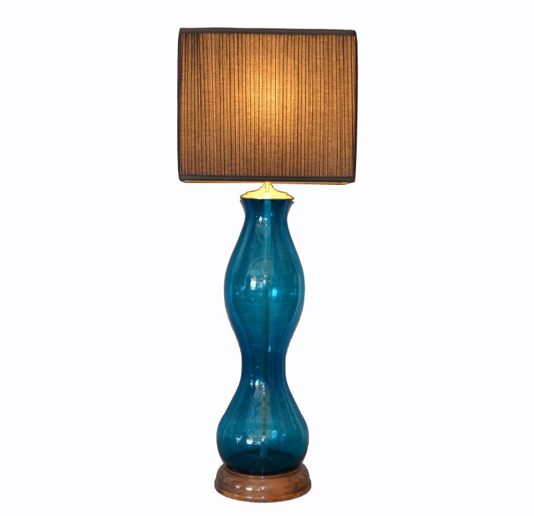 Original Tall Midcentury Modern Blue Hand Blown Art Glass Table Lamp by Blenko For Sale at 1stDibs