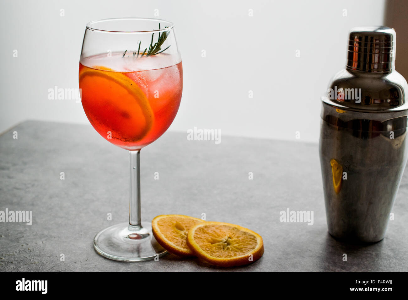Aperol Spritz Cocktail with Orange Slice, Rosemary and Ice. Alcoholic