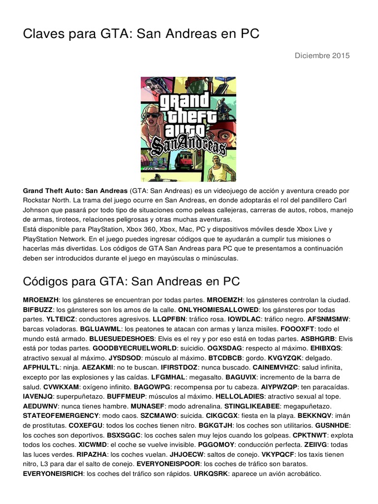 Todos Os Códigos Do GTA San Andreas para PC PDF Clave Gta San Andreas Pc Inmortal Todos los trucos gta san andreas. The intended phrase that rockstar originally programmed, and alternative shortcodes that the. A continuación tienes la lista de todos los trucos para gta san andreas para las distintas plataformas. Consigue todas las armas, hazte con munición y vida infinita, y desata el modo caos en pc con estos trucos de gta san andreas. Máxima. Clave Gta San Andreas Pc Inmortal.