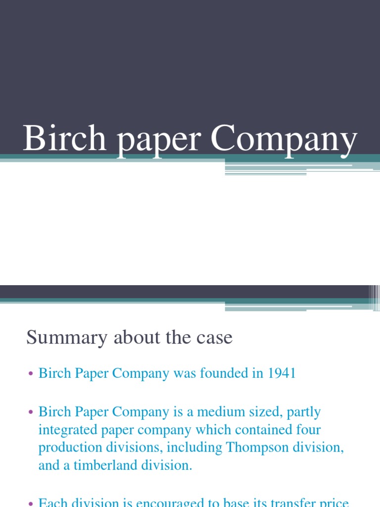 PPT BIRCH PAPER COMPANY PowerPoint Presentation, free download ID Birch Paper Company Transfer Pricing Solution The objectives of this case is whether the northern division of birch paper company should buy corrugated boxes for a new product internally from the thompson division at a transfer price. Birch paper company is a classic case that provides an excellent opportunity to present, analyze, and evaluate transfer pricing issues. What is the economic impact to birch paper company. Birch Paper Company Transfer Pricing Solution.