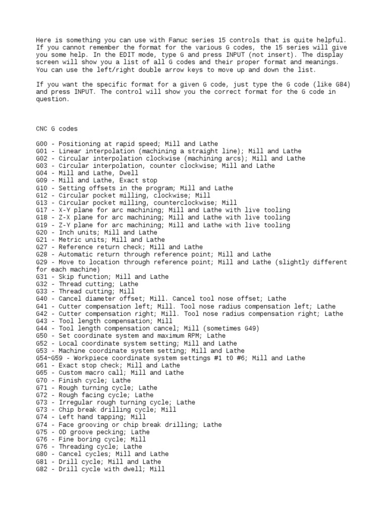 Fanuc Cnc G Code and M Code List Pdf Fanuc G-Codes Learn how to program fanuc cnc lathe with g/m codes, a set of instructions that control the machine tool's movements and functions. Find out the differences between fanuc, linuxcnc, grbl, and haas dialects and how to use them in your cnc programming. Find the meaning, syntax, and examples of each g/m code, from g00 to g99, in this comprehensive guide. Fanuc G-Codes.
