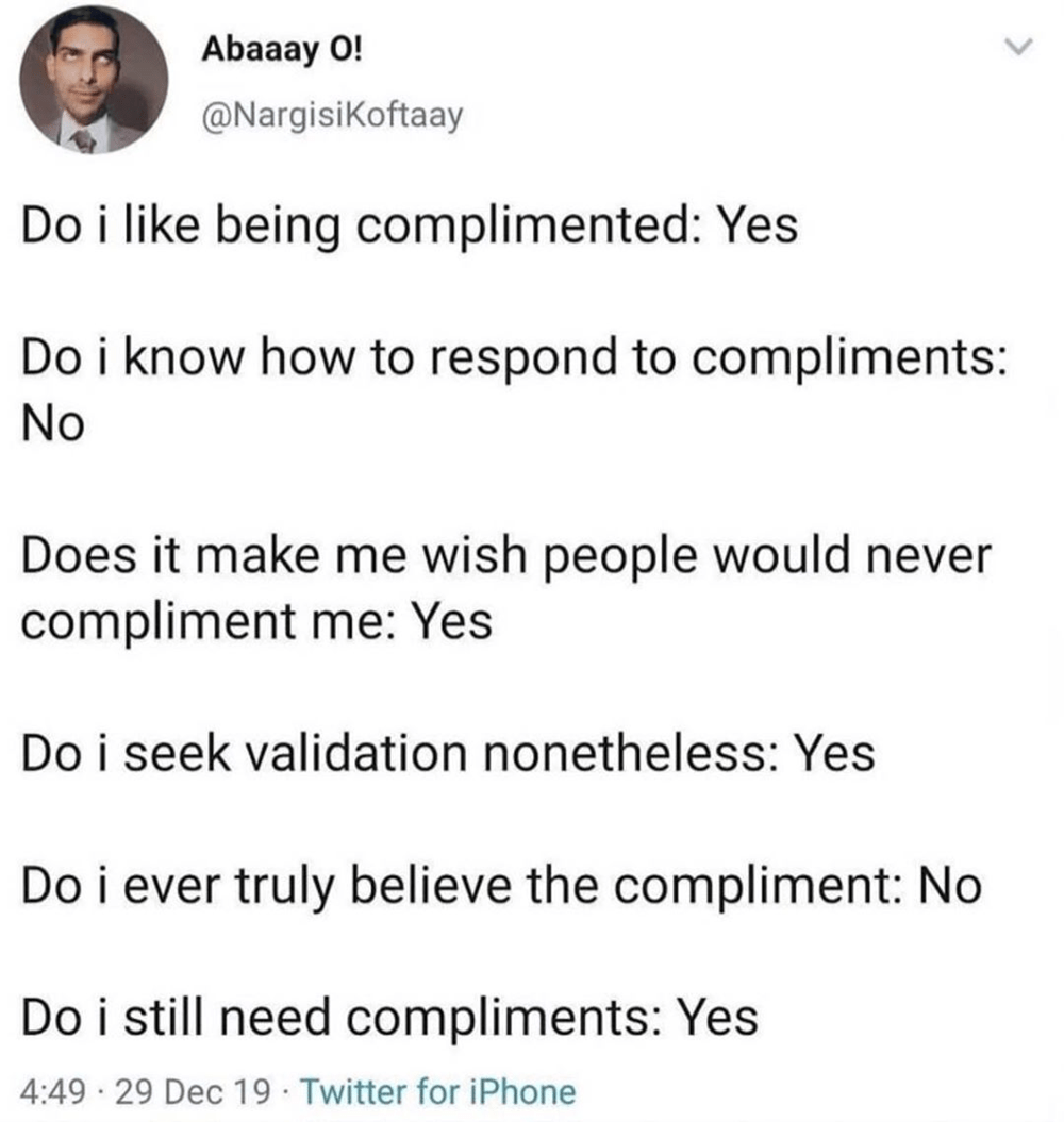 When you give compliments to bae, New funny memes, Funny memes about My Girl Never Compliments Me If a girl has been ignoring your compliments then you might be wondering why and what it means about the way that she feels about you. The emotional damage has negatively impacted you and compromised the relationship. My girlfriend's lack of compliments is not indicative of her feelings for me, but rather a reflection of her unique communication style. I. My Girl Never Compliments Me.