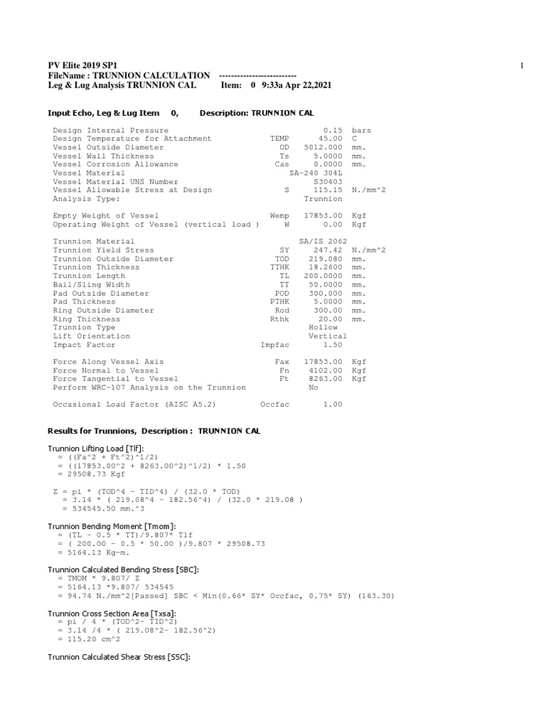 Lifting Trunnion Calculations Sample PDF Stress (Mechanics) Bending Trunnion Calculation Kellogg Sg = bending stress in pipe shell, psi. There are several methods to analyze trunnions. Local stress calculation based on kellogg’s model for local stress calculation in a discontinuity area, depending on loading condition, a pipe stress engineer can use two models: = load induced by the attachment, ibs per linear. It is simplified kellogg method, original kellogg method and. Trunnion Calculation Kellogg.