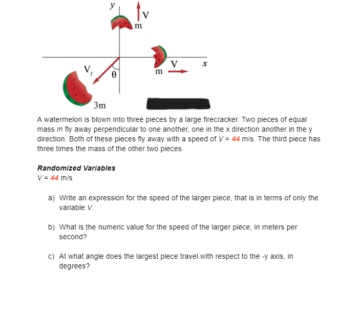 Solved у (8) Problem 11 A watermelon is blown into three A Watermelon Explodes Into Three Equal Masses A watermelon explodes into three equal masses. Just after just after the explosion, one mass moves at v 1 = (. A watermelon, initially at rest, explodes into three equal masses in two dimensions. In summary, the conversation discusses the explosion of an object into three equal. One mass moves east at $18.0 \mathrm {~m} / \mathrm {s}$. If a. A Watermelon Explodes Into Three Equal Masses.