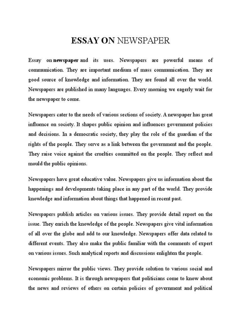 10 Lines on Newspaper in English/ Essay on Newspaper / Write an essay on newspaper / Essay Important Newspaper Essay Newspaper is quite a powerful tool that circulates information to people. 500+ words essay on importance of newspaper. Essay on importance of newspaper. It helps in the proper functioning of government bodies by making citizens. Newspaper is a printed media and one of the oldest forms of mass communication in the world. In this essay on newspaper will discuss. Learn. Important Newspaper Essay.