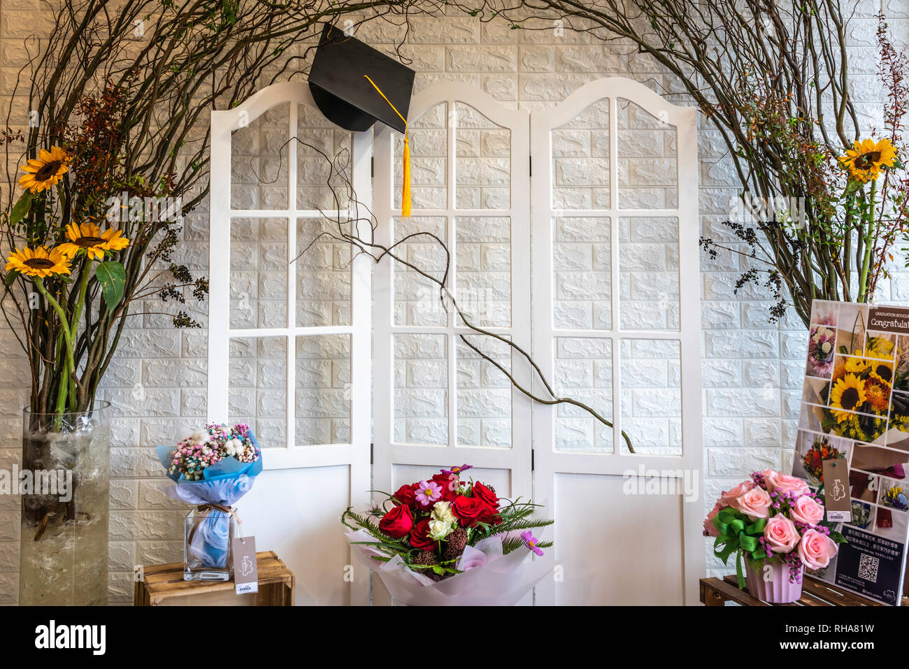 A graduation display in a flower shop in the Flower Market of Kowloon