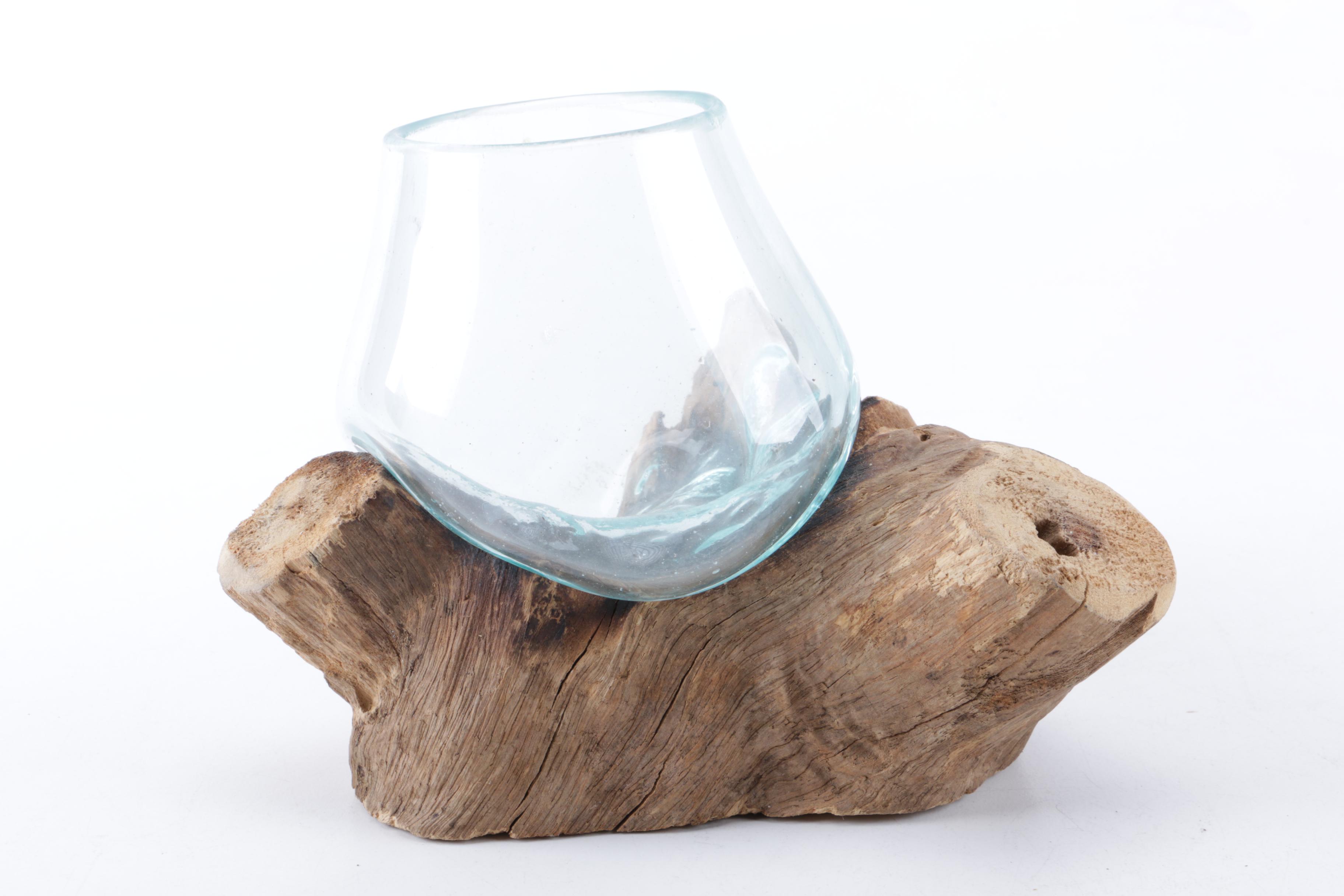 Hand Blown Molten Glass Vase in Raw Wood Base EBTH Molten Glass Vase On Wood blown glass on driftwood, gamal, molten glass, terrarium, hand blown recycled glass, natural piece, housewarming. experience the beauty of molten glass fused with wood in our molten glass on wood collection. Beautifully handcrafted molten glass on wood. this glass vase is perfect for those who want a vase to be much more than just a simple object.. Molten Glass Vase On Wood.