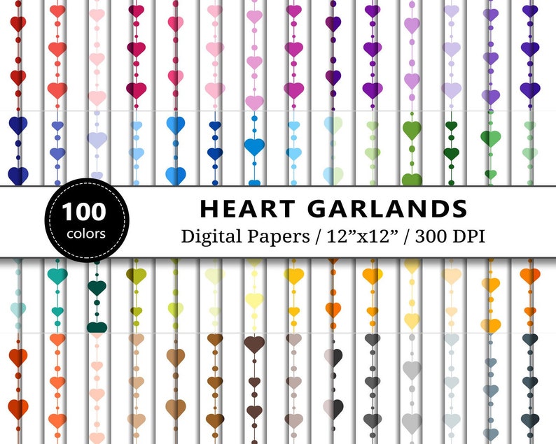 Heart Garlands Digital Paper, 100 Rainbow Heart Garland Pattern
