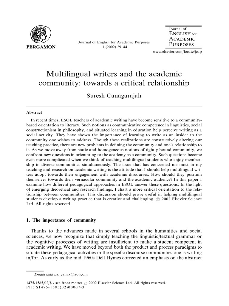 Multilingual Writers and The Academic Community Towards A Critical
