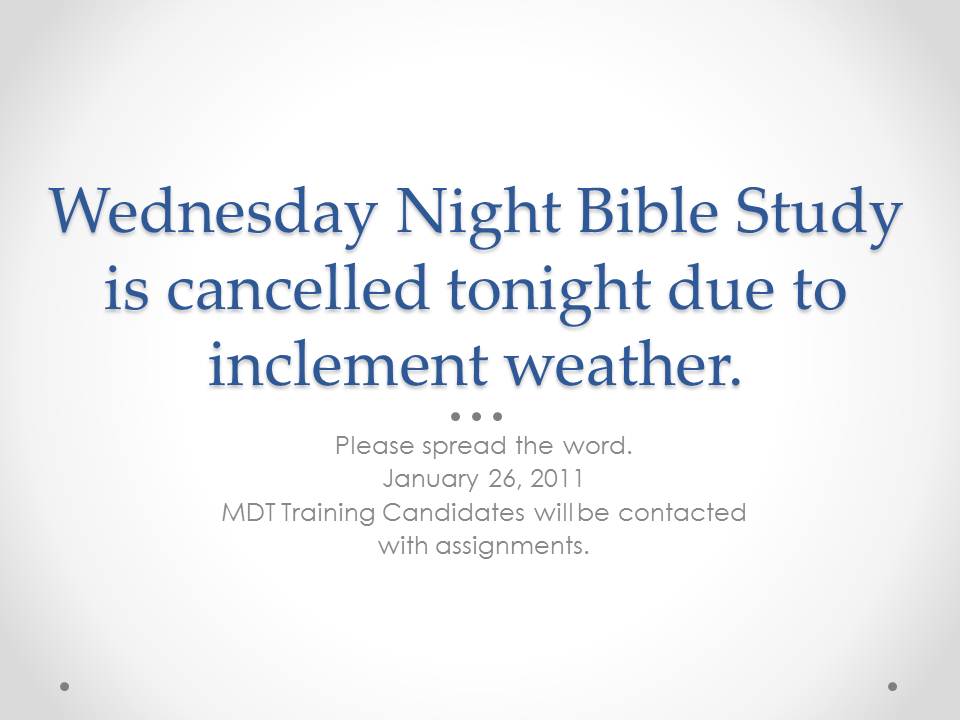 Words of Life Bible Study Cancelled Tonight! 1.26.11 Bible Study Cancelled Create free bible study cancelled flyers, posters, social media graphics and videos in minutes. Author and speaker beth moore speaks. Bible study for the night of 2/3/21 has been cancelled due to inclement weather, to be rescheduled for 2/17/21 There is little concern for due process, and in its place are immediate. (rns) — the famed bible study teacher said. Bible Study Cancelled.