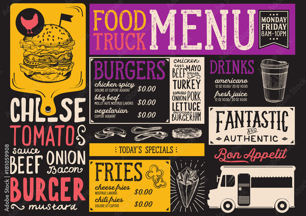Food Truck Menu Template Free Explore venngage's food truck menu templates, designed for mouthwatering presentations that satisfy appetites and showcase your culinary. Menuzen helps you create a branded and interactive menu that. Use these food truck menu templates to design or refresh your menu. Learn how to make a food truck menu with menu development, menu design, menu engineering, and more. Download and customize free. Food Truck Menu Template Free.