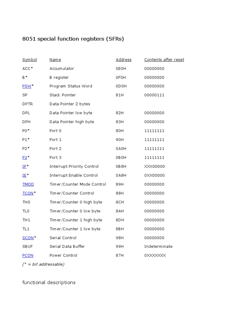 List of 8051 Microcontroller Special Function Registers PDF Pointer Types Of Special Function Registers In 8051 In the 8051, register a, b, dptr, and psw are a part of the group of registers commonly referred to as sfr (special function registers). Some of these special function registers are bit addressable. The 8051 family of microprocessors provides a distinct memory area for accessing special function registers (sfrs). In 8051 micro controller there are 21 special function registers. Types Of Special Function Registers In 8051.